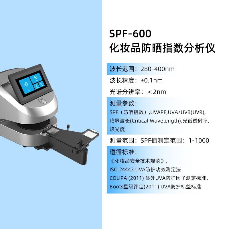?高校/科研院所:防曬原料與基礎配方性能評價SPF600以標準波段、穩定輸出、操作簡單、高性價比,成為常規防曬檢測場景的“剛需機型”,讓每一次測試都高效、合規、可追溯。